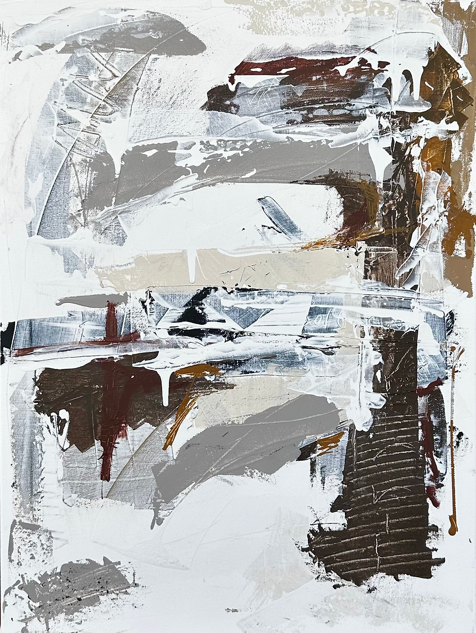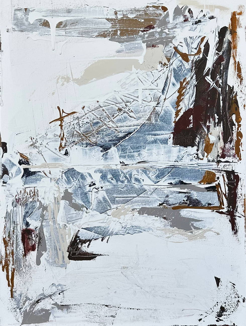 Texture plays a central role. Thick, tactile passages collide with thinner, ghosted veils of paint, creating a surface that feels excavated rather than painted. Marks appear both deliberate and accidental—scratches, abrasions, and softened edges suggesting past gestures that linger beneath the present moment. These traces act as visual echoes, reinforcing the dialogue between what is seen and what is felt.